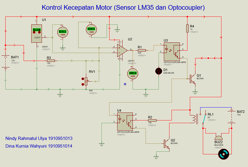Ketika sensor mendeteksi suhu di 32 derajat celcius ke atas, maka akan ada tegangan yang keluar dari sensor dan arus akan mengalir ke kaki inverting op amp dimana fungsinya sebagai detektor inverting. Karena tegangan input di kaki inverting lebih besar dari tegangan di kaki non inverting, maka output yang dikeluarkan mendekati -Vcc atau mendekati nol. Karena arus output kecil sehingga U1 tidak aktif, mengakibatkan Q1, U2, dan Q2 tidak aktif juga. Jika Q2 tidak aktif, maka arus dari sumber, ke relay, tidak bisa melewati Q2 sehingga relay off dan motor serta buzzer juga off.